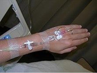 大多的化療藥是通過靜脈注射的方法進入人體,需要的時間可以由數分鐘到數小時。很多時注射化療藥是通過一條很幼和柔軟的管子——中央靜脈導管 (central venous line or central line) —— 它會由上胸或手臂進入較深層的靜脈血管;這樣便可避免在每一次治療時都要用一次性的靜脈膠管插在病人的手背上。同時,通過這條中央靜脈導管,醫生亦可以把其他藥物輸入病人身體,或進行血液抽取。中央靜脈導管可以保留數個月甚至一至兩年。