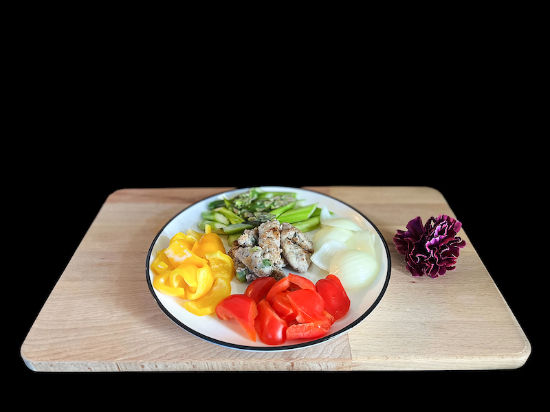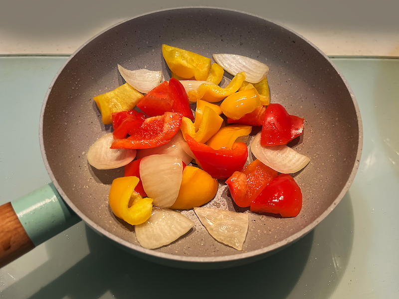 - Remove seeds and cut yellow and red bell peppers into pieces. Remove onion skin and cut onion into pieces. Remove woody part of asparagus, section and blanch asparagus.