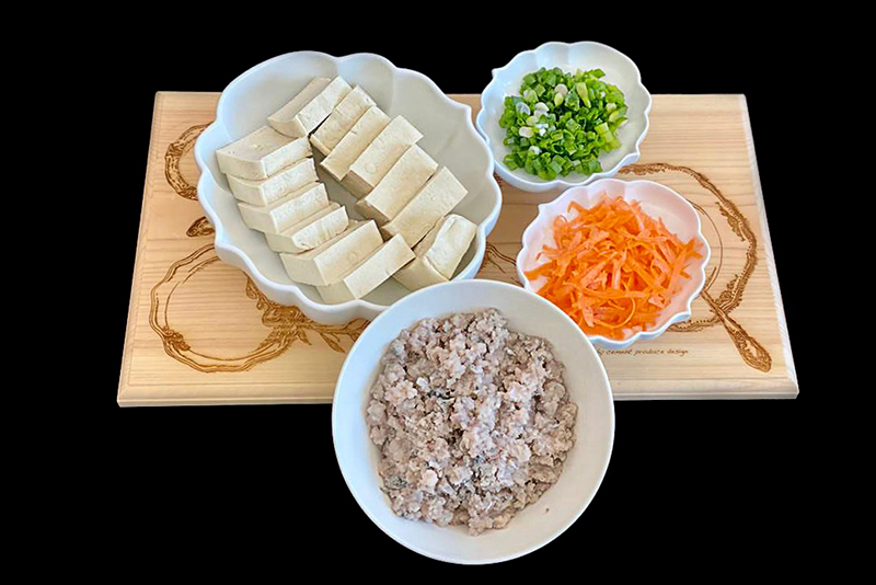- Evenly place the minced dace fish on the tofu. Sprinkle with diced carrot. Steam for 10-15 minutes or until cooked.
